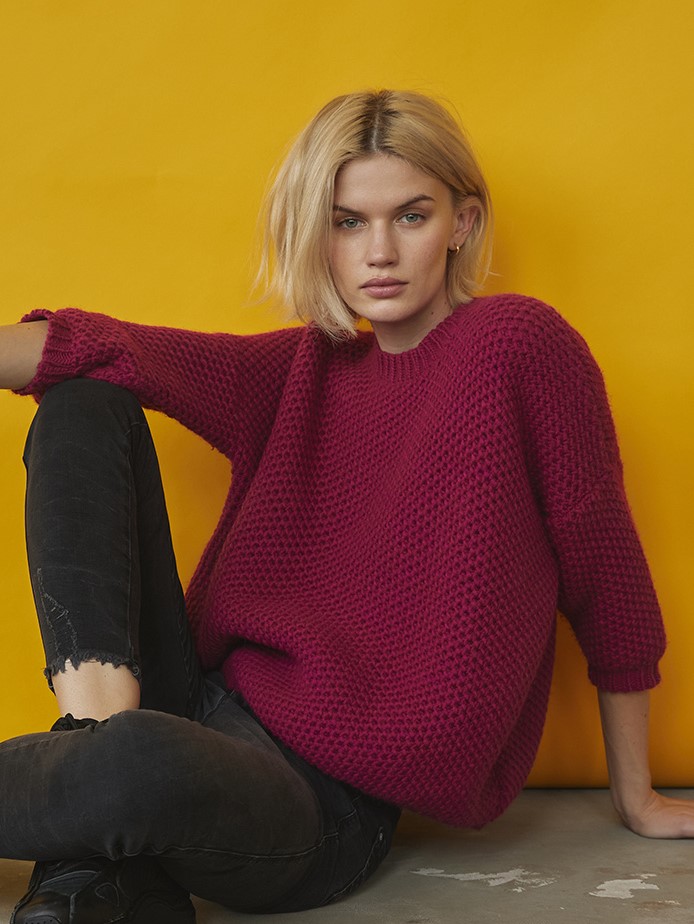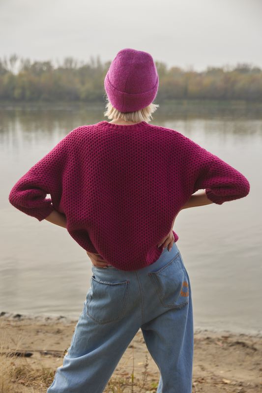 OVERSIZE SWEATER RED WHINE. Miękki i delikatny. Dzięki mieszance wełny z akrylem i alpaką sweter ma przyjemny chwyt. Mięsisty materiał, prosty shape, który gwarantuje wygodę noszenia. Rękaw ¾, okrągły dekolt, mięsista listwa wykończeniowa. Skład przędzy daje Ci pewność, że kupujesz produkt na kilka sezonów. Kolor nasycony, głęboki, bardzo twarzowy!
