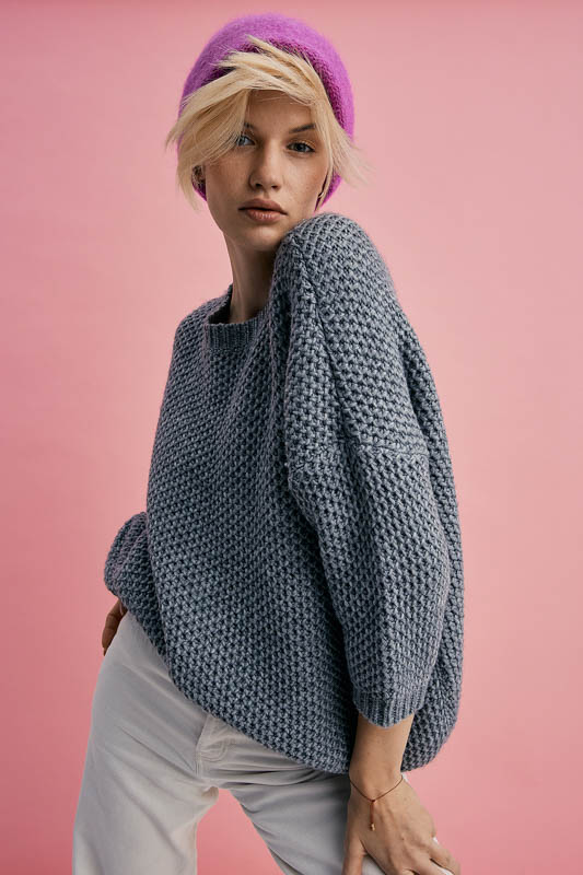 Nasz SWEATER OVERSIZE jest lekko pudełkowy, z okrągłym wycięciem i rękawem ¾. Do tego jest miękki i delikatny. Dzięki naprawdę dobrej mieszance wełny z akrylem i alpaką sweter ma przyjemny chwyt. Akryl w tym przypadku jest na plus, dzięki niemu sweter trzyma fason po praniu i wełna nie kulkuje się tak bardzo. Mięsisty materiał, prosty pudełkowy shape, który gwarantuje wygodę noszenia. Splot oczek jest wielowymiarowy, nie prześwituje ale ma swój charakter. Po mimo, że jest to rasowy basic to ma to coś co go wyróżnia.